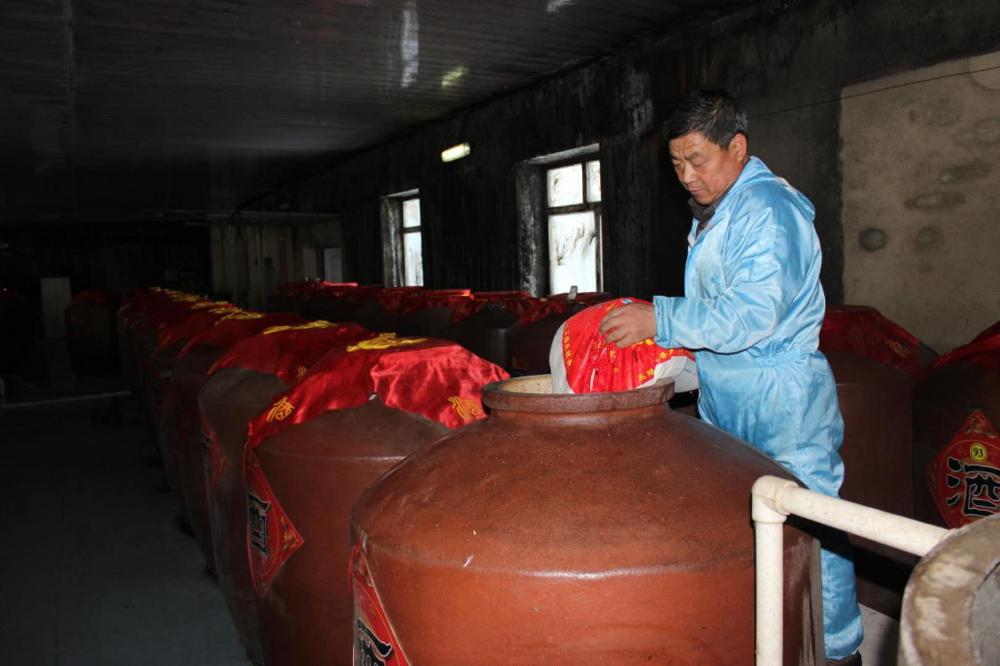 酿酒师正在精心往发酵缸内倒入粮食