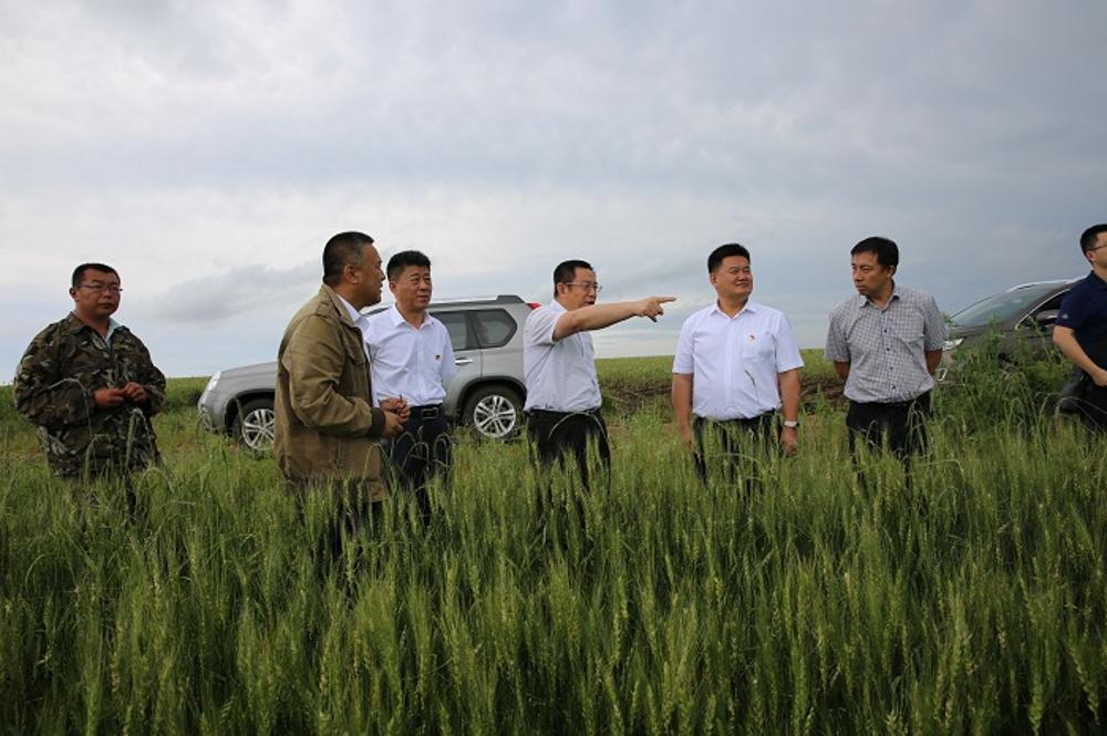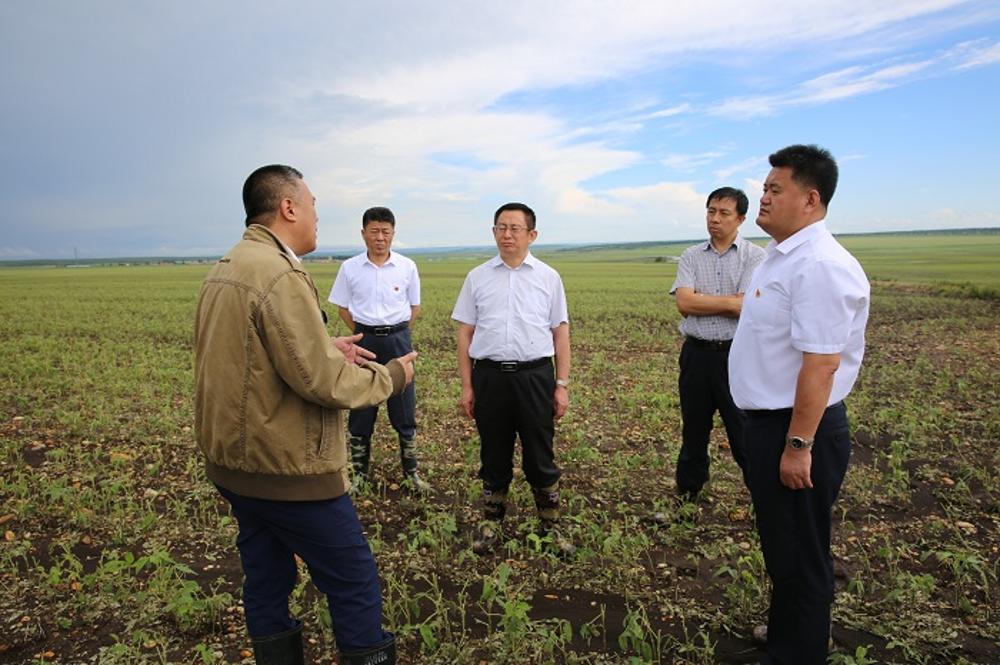 于志浩在公司党委书记郭长福、公司党委副书记、总经理王显志以及公司副总经理鲍德海的陪同下深入公司第四农场受灾田间地头,实地查看冰雹灾害后农作物受灾情况,了解受灾面积、损失情况等。